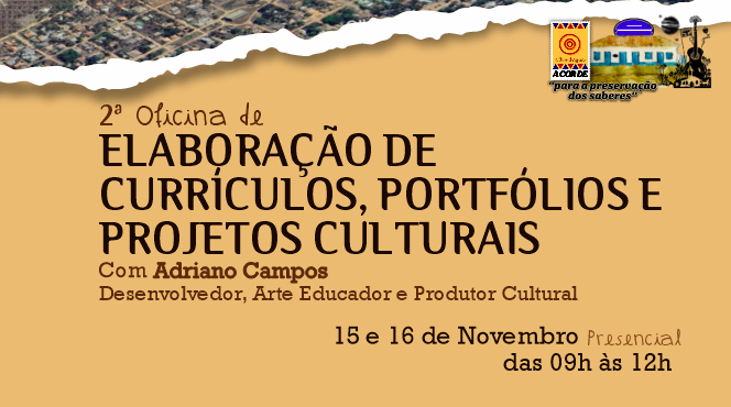 O projeto ACORDE Para a Preservação dos Saberes está promovendo a 2º Oficina Presencial e Mentoria de Elaboração de Currículos – Portfólios e Projetos Culturais, com carga horária de 10 horas.