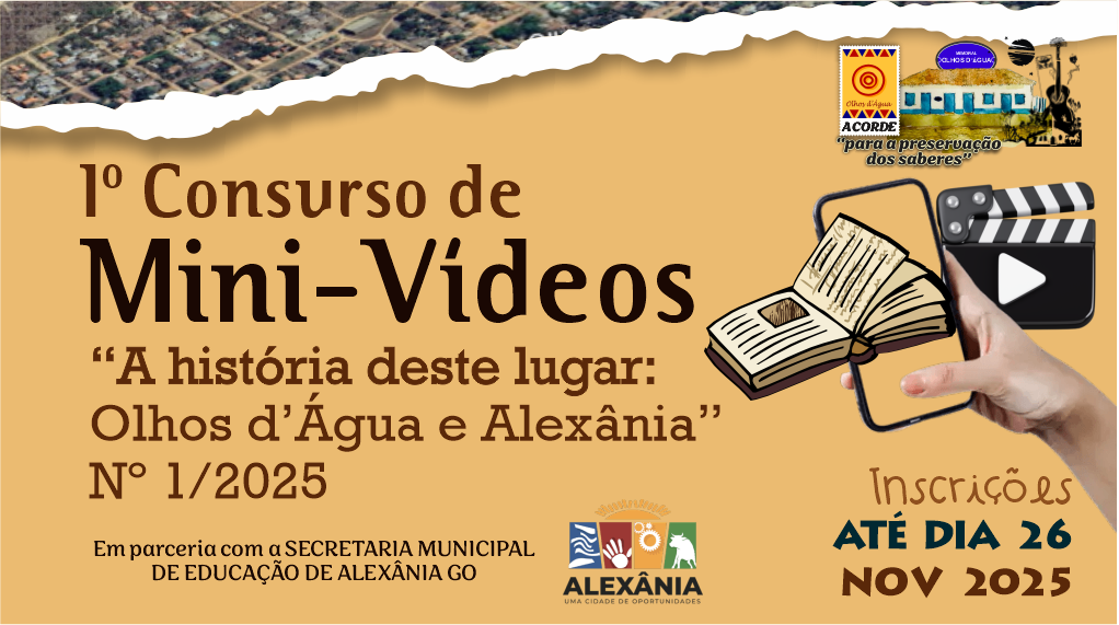 O projeto ACORDE – Para a Preservação dos Saberes, torna público o Edital do 1º Concurso de Mini-Vídeos “A história deste lugar: Olhos d’Água e Alexânia” Nº 1/2025, voltado para alunos da rede pública de ensino do município de Alexânia e do distrito de Olhos d’Água.